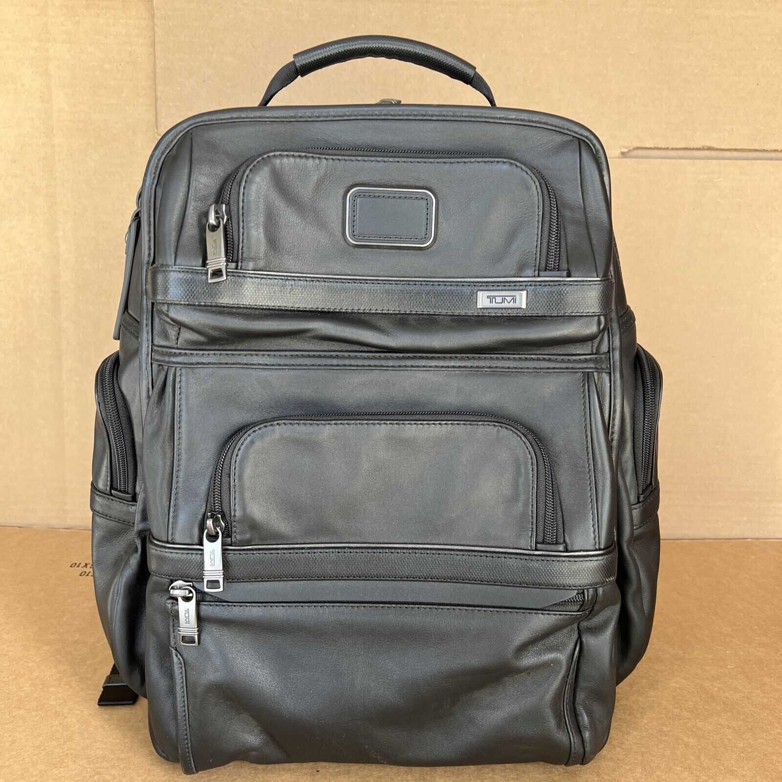 - Padded adjustable straps and leather-wrapped top carry handle