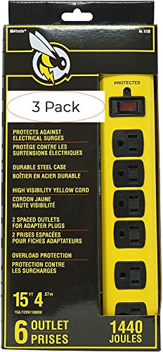 The Yellow Jacket 5138N 5138 Metal Surge Protector Strip is a heavy-duty power strip designed for use in a workshop or other rugged work areas. With 6 grounded outlets and 2 spaced outlets for adapter plugs, it allows you to power multiple appliances simultaneously. The 15-foot yellow power cord is highly visible and has a clip for added safety. Sliding safety covers protect the outlets from debris, and a lighted switch indicates when the power block is on. The surge protector is impact resistant, providing protection against minor drops. The strip comes in a yellow and black color combination and has dimensions of 15.25Lx1.75Wx5.63H.